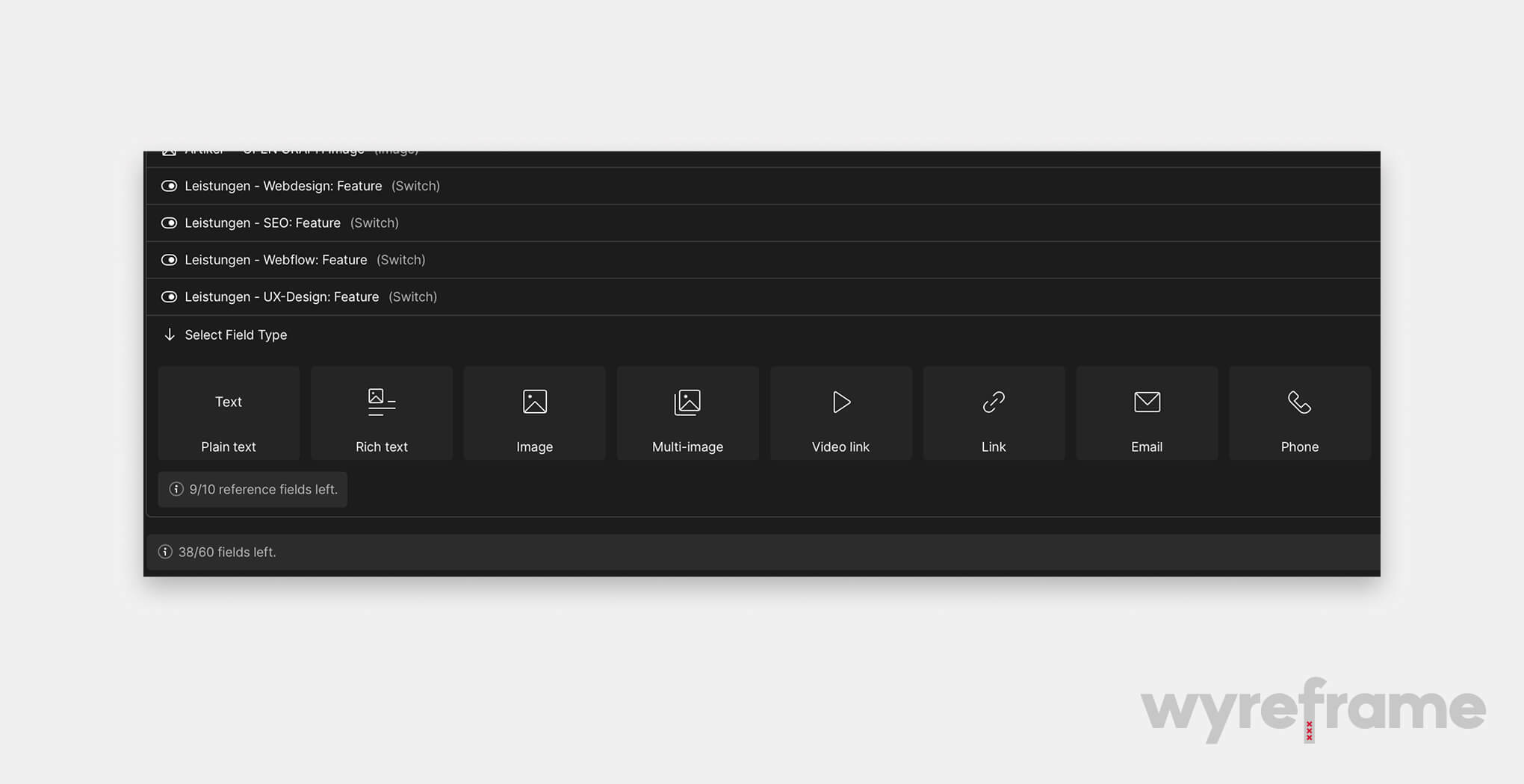 Du kannst aber auch Datum, Farben, Buttons, Booleans, Switches oder Zahlenfelder nutzen. Alles, was du brauchst, um deinen Content sauber zu strukturieren. Und das Beste: Diese Felder lassen sich auch in deiner Gestaltung ansprechen. Wenn du zum Beispiel ein Textfeld namens “Teaser” erstellt hast, kannst du genau diesen Inhalt im Layout platzieren und bei jedem Eintrag individuell füllen. Ohne das Design nochmal anfassen zu müssen.