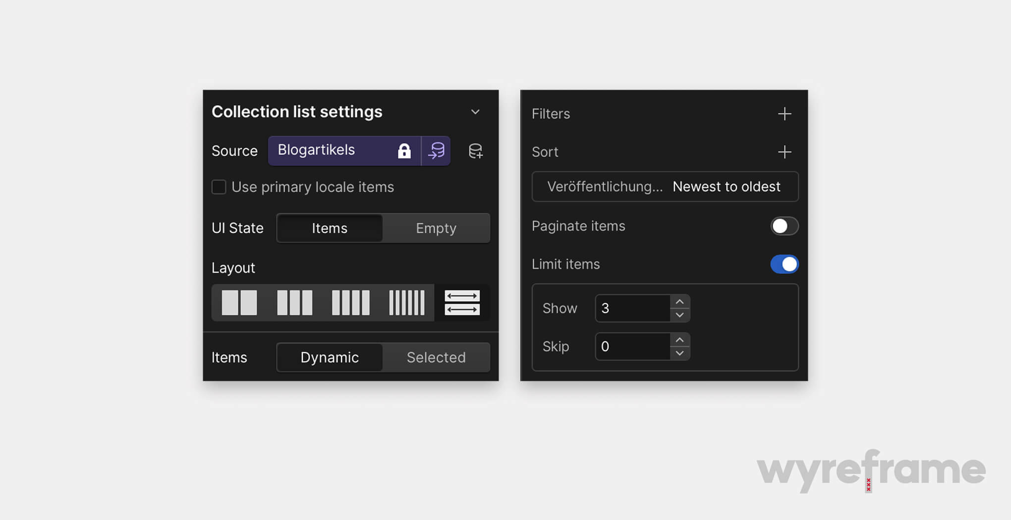 Die Collection List ist wie ein Container, der automatisch alle passenden Einträge aus einer bestimmten Collection abruft. Du legst fest, wie viele davon angezeigt werden sollen, in welcher Reihenfolge und mit welchem Design. Der Inhalt kommt dann dynamisch aus dem CMS.
