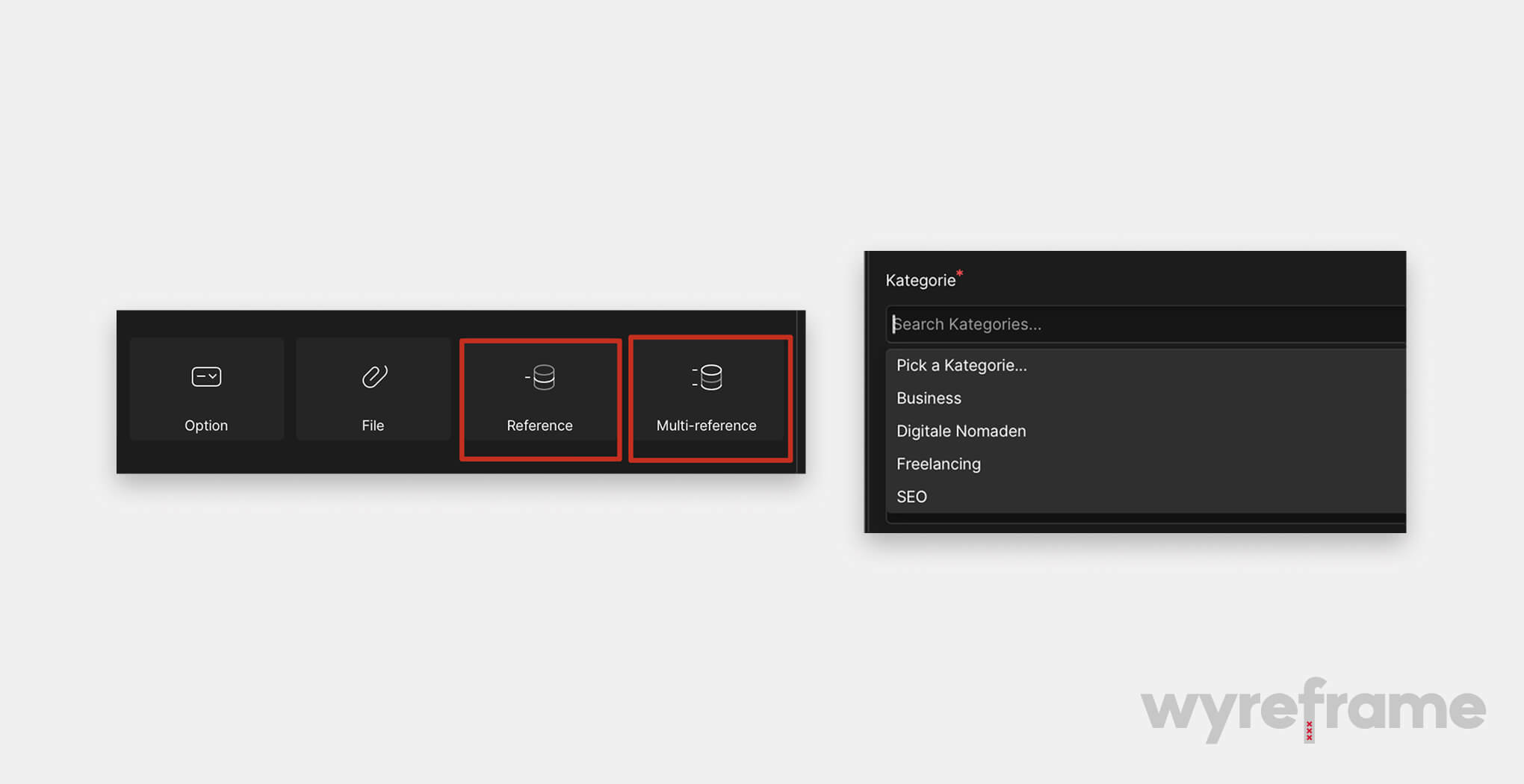 Referenzfeld: Du verknüpfst einen Eintrag mit genau einem anderen Eintrag aus einer anderen Collection. Zum Beispiel: